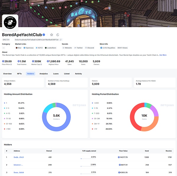 返回数据信息主要对持仓地址的价值进行了排行,并返回其持有该 NFT Collection 总值及占比,可参考 NFTScan Holders: