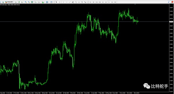 如图比特币日线,从6月底开始价格冲高未有延续,价格疲软震荡回落,高点逐渐降低,但是幅度并不大,走势也较为缓慢。本月前4个交易价格多空博弈较为激烈,日线连续报收较长上下影线小实体的十字星。