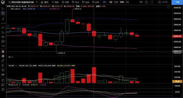 四小时来看行情目前围绕着布林带中轨位置运行,多头能量柱持续缩量运行中,布林带的方向还没有明确,预计在等待晚间的非农数据。MACD的走势主要以震荡为主,KDJ三线合并,因此行情会有一波小幅反弹后再去走下跌,行情在触及上方30000支撑后一路连阴下行,说明上方压力交大,回落虽伴随着反弹,但反弹力度并不大,日内操作上还是以高抛低吸操作即可!