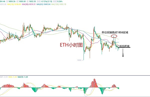 8月4日以太坊(ETH)合约技术面分析:今日方面,大周期日线级别昨日报收小阴线,K线形态上连阴下跌,价格运行于均线下方,附图指标死叉向下,虽说力度和延续行比较差,但是整体呈震荡下行的走势还是比较明显的,多次触及下方低点支撑,高点下移,所以后市我们继续看空。短周期小时图昨日美盘反抽高点在1856区域附近,而我在群里多次强调四小时图和日线图阻力位在1865区域,而1850是修正的高点,不是阻力,凌晨价格二次承压回撤,且反抽没有力度;因此今日ETH短线合约交易策略:昨日空单持有的朋友继续持有,没有空单的朋友现价1835区域直接空,止损1860区域,目标看1810-1805区域