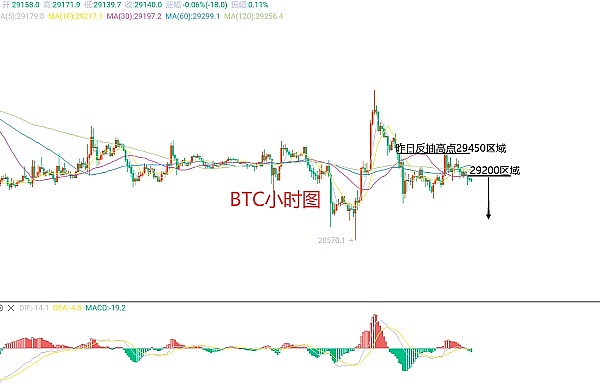 8月4日比特币(BTC)合约技术面分析:今日方面,大周期日线级别昨日报收小阴先,K线形态上连阴下跌,附图指标死叉向下,价格高点下移且多次尝试破低向下要价;虽说近期的单日价格涨跌波动不是很大,但是对于合约来说是够了的,继续保持短线即可。短周期小时图昨日日内震荡欧盘探底未果晚间美盘反抽高点在29400区域而这个位置正好是前一日修正的高点附近,这样来说反抽力度很小,凌晨后价格二次承压回撤,当前K线形态连阴,附图指标死叉向下,所以日内还是要跌的;因此今日BTC短线合约交易策略:昨日空单持有的继续持有,没有持有的现价29200区域直接空,止损放在29450区域,目标看28800-28600区域;