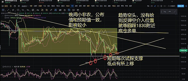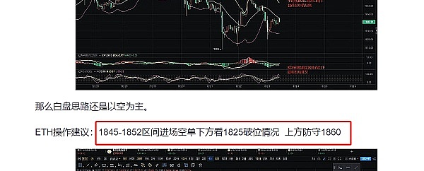 昨日ETH白盘一直在走弱,文章中思路也非常明显就是看空,给出的空单也刚好达到了止盈位1825附近