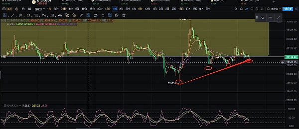 BTC从上图来看,价格跌破箱体后先是形成双针探底形态,后面在29000这个位置试探了两次之后价格依然是运行在29000上方,短线来看29000这个位置有支撑,并且目前整体还是一个看反弹的趋势