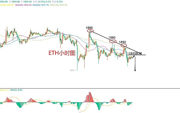 8月5日以太坊(ETH)合约技术面分析:今日方面,大周期日线级别昨日报收小阴线,K线形态上连阴,价格运行于均线下方,附图指标死叉向下;而昨日价格受到数据影响,短线冲高凌晨承压回撤,今日早间延续下跌但力度差些没有向下破位前期低点支撑,所以还不是积弱走势,震荡下行整体趋势;短周期小时图昨日开跌口位置在1850区域附近,低点在1809区域附近,那么今日周末我们还是要看区间震荡走势,不去过分看破位了,因此今日ETH短线合约交易策略:反抽1835区域空,止损1850区域,目标看1810-1805区域;