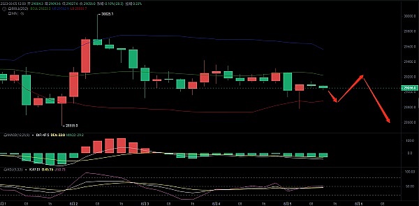 1小时图来看K线多次探底受到下轨支撑后,回调至中轨下方运行,目前还是维持震荡行情。BOLL布林通道三线有缓慢缩口下行的迹象。MACD粘合金叉后动能住缓慢放量形成上升的趋势,KDJ三线向下发散。