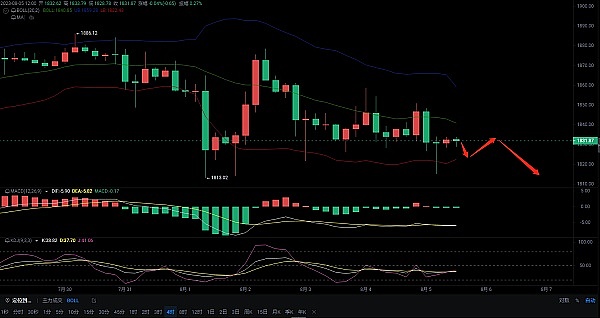 4小时图了来看上轨向下缩口明显。中轨受到压力缓慢下行。MACD粘合后形成死叉。附图指标KDJ金叉向上运行。短期建议做空。