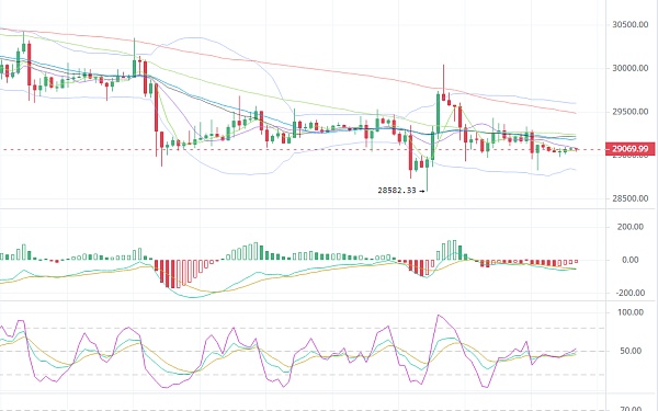 比特币现阶段行情结构保持震荡,昨日早间回撤试探支撑在28800一线,周末行情较为平淡,目前从4小时方面来看,币价位于BOLL中峡谷运行中。下方MACD有交叉形成金叉之势,KDJ三线聚合呈现向上,结合走势来看,行情或走出一波反弹。所以我们交易思路上保持前日多单思路即可!