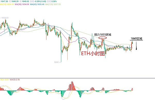8月7日以太坊(ETH)合约技术面分析:今日方面,大周期日线级别昨日报收小阳线,K线形态上连阴单阳,价格运行于均线下方,附图指标死叉向下,且周末的反抽是价格回归均线阻力所以也是修正的一种表现,而不是走势信号;短周期小时图自上周开始价格不断试探下方低点支撑1800区域,虽说没有破位让人焦急,但是每一次的反抽力度都不大而都是修正的走势表现为主,所以我们还是要看空破位,不要着急,阻力位置1855区域,支撑位置1808区域;因此今日ETH短线合约交易策略:反抽1840-1845区域空,止损1856区域,目标看1810-1805区域