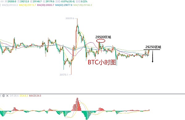 8月7日比特币(BTC)合约技术面分析:今日方面,大周期日线级别昨日报收小阳线,K线形态上连阴单阳,而收阳的时间点在周末,那么就不是反弹的信号,只是修正的一种,这个表现也是比较明显的,第一:价格破高显然是没有那个力度的;第二:当前的反抽价格只是回归了均线而已,并没有突破;所以大趋势上还是看空不变。短周期小时图目前走势还是在区间之内,即使当前高点下移,但是没有向下破位前区间还是有效;因此今日BTC短线合约交易策略:反抽29250-29300区域空,止损29500区域,目标看28800-28600区域;