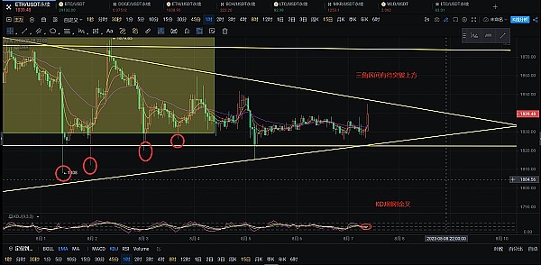 KDJ小时线级别也刚刚形成金叉,短期上方还有空间,只是目前面临的是三角区间上方的压制。压制位在1846 。
