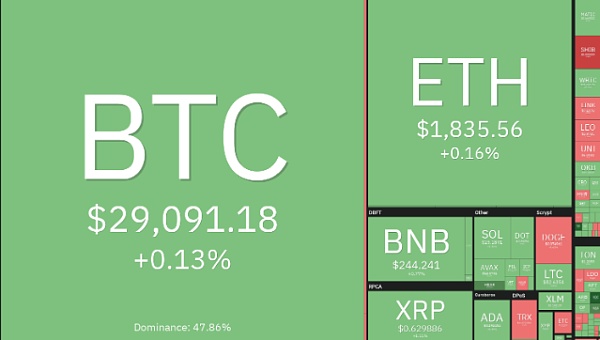 比特币在 8 月 5 日形成了日内烛台模式,表明多头和空头之间犹豫不决。价格在 20 天指数移动平均线(29,430 美元)和水平支撑位 28,861 美元之间受到挤压。