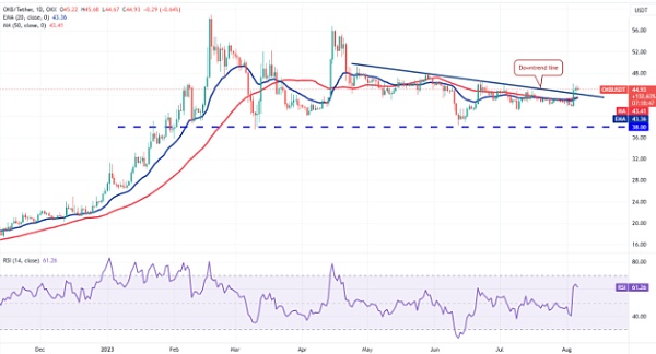 过去几周,OKB(OKB)一直在 38 美元至 59 美元之间的大范围内逐渐下跌。8月4日,多头将价格推升至下降趋势线上方,表明短期下降趋势可能即将结束。