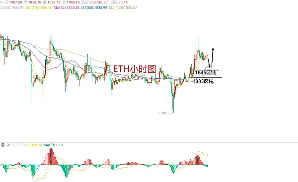 8月9日以太坊(ETH)合约技术面分析:今日方面,大周期日线级别昨日报收小阳线,K线形态上连阴单阳走势,但昨日价格反抽力度过大且向上破位了前一日的高点位置;附图指标快慢线有粘合金叉迹象,如果价格延续上涨那么日线会转阳上涨趋势;届时需要关注的就是1930区域和2030区域阻力;短周期小时图昨日价格强势上涨破位前一日高点,美盘小幅修正,低点位置在1835区域,后二次向上,而凌晨的低点位置在1845区域附近,所以今日看延续上涨那么回撤力度就不能大,因此今日ETH短线合约交易策略:回撤1840-1845区域多,止损1834区域,目标看1880-1900区域;