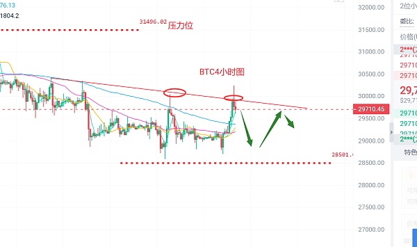 大饼昨日高点30240附近,低点29150附近。大饼在昨晚走了一波拉升,最高向上插针触及30244附近后开始回落,并没有有效突破30000关口,近期上下插针次数也不少,说明主力在不停的洗筹,加上市场匮乏流动性,洗筹还将继续,目前大饼处于下降趋势中,短线有些强势,注意防范再次上攻30000关口 。