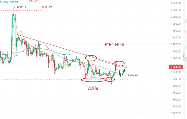 以太坊昨日高点1876附近,低点1826附近,以太在昨日凌晨向下插针触及1802后开始走反弹拉升,并没有有效跌破1820,在今日凌晨向上插针后回落,没有有效突破下降趋势线,整体依然处在收敛口中,耐心等待市场选择方向。