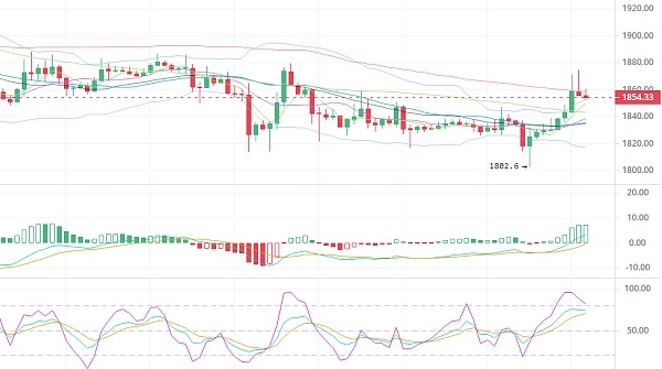 四小时上探1874下探回升收复部分失地,回落触及关口不破空头难有延续,短期反弹收复也是正常修正,日内仍需关注1850一线企稳情况,只有企稳此位才有进一步收复可能,目前布林带开始逐渐开口,但仍需一定时间震荡修正,同时日线也是逐渐拐头向上,短期整体形态也是在向多头转变,日内思路上可以保持低多思路不变,看1900一线破位情况。