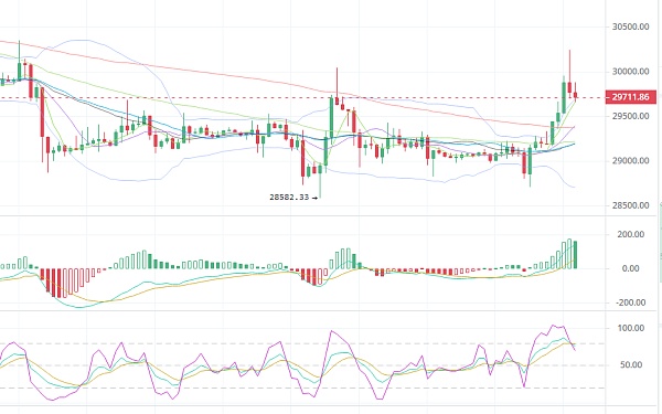 昨日多头一路慢性震荡上行,最高在凌晨冲至30250一线,日线级别来看,目前在29800附近震荡,MACD多头开始放量,多头动能充足,从盘面上看,短期行情走势比较缓慢,在走出一波区间后往往都没有一个延续性,前面多头强势反弹后主力纷纷抛授,所以又下行至低位震荡,而目前再度冲高并突破高位。周线上boll上轨已有拐头向上延续,趋势上已确立为多,那么还有一定上行空间,从四小时来看,走势结构上,行情在前期影线下探之后未能延续,在昨日延续了涨幅持续走高,偏强震荡,一路连阳,布林带开口张开,下方KDJ三线拐头向下有交叉之势,MACD两线持续上扬,能量柱持续放量。结合一小时来看,下方KDJ三线交叉向下,MACD能量柱缩量,币价冲高过后迎来短暂的回调,整体多头趋势强烈,回撤力度不大。日内操作建议还是做多为主。