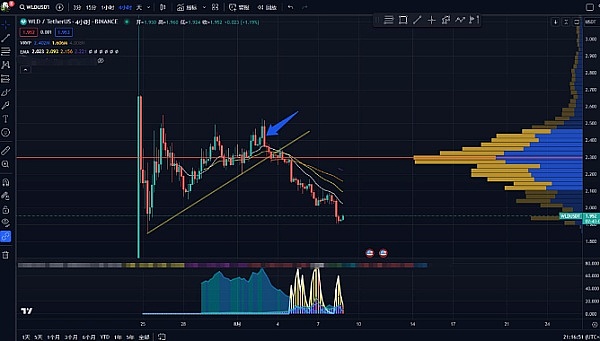 我全程明牌在群里购买的WLD,建仓成本就在7月25日第一波下跌的针尖1.886,之后两次加仓。WLD在结构上沿着黄色趋势线走了一个4H上升三角形,这种三角形出现在开盘早期,基本上是稳定上升突破的。但在我标注的突破位置,蓝色箭头处,出现了不正常放量。