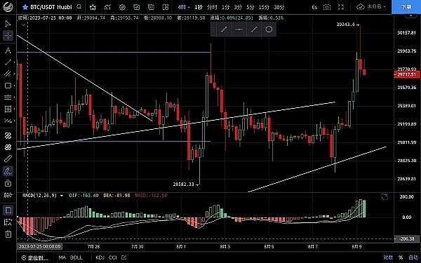 大饼昨日整体呈上行走势,早间行情冲高至30200一线迅速回落,低位跌至29670附近支撑,目前币价在29715附近运行,四小时级别行情三连阳后插针,k线由阳转阴,macd绿色能量柱空心转实心多头减弱空头增强,短期来看有回踩需求,关注四小时收线若收在ma200下方则有延续的可能,日线级别macd空头转多双线呈金叉状态,上方阻力较强多头未能延续,日内关注回踩力度29500支撑不破回踩低多为主,上方压制30000-30300,下方支撑29500-29200