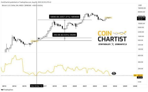NewsBTC 使用布林带广泛报道了比特币缺乏波动性的问题。布林带是趋势跟踪、带突破交易系统的一部分,也可用于衡量波动性。但这不是阅读它的唯一方法。其他波动率指标包括隐含波动率(使用 VIX 来预测未来波动率)和历史波动率 (HV)。HV,就像听起来的那样,着眼于过去的波动性。BTCUSD 6W 历史波动率目前处于历史第二低水平。这很重要,因为当长时间的横盘阶段结束时,接下来就是大行情的到来。