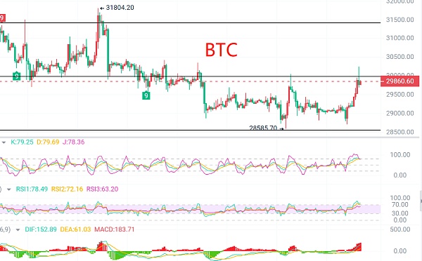 技术结构来看四小时图,K线重回上行通道中运行,台阶震荡摸高。此前的弱势盘整皆是在蓄势中,目前30000整数关口作为次高点的多空分水岭,日内留意破位后的启稳情况,当下回踩的力度不算太强,白盘偏向迂回整理,短线依托凌晨的回落止跌点29700附近作为多单的参考点进场继续顺势做多.