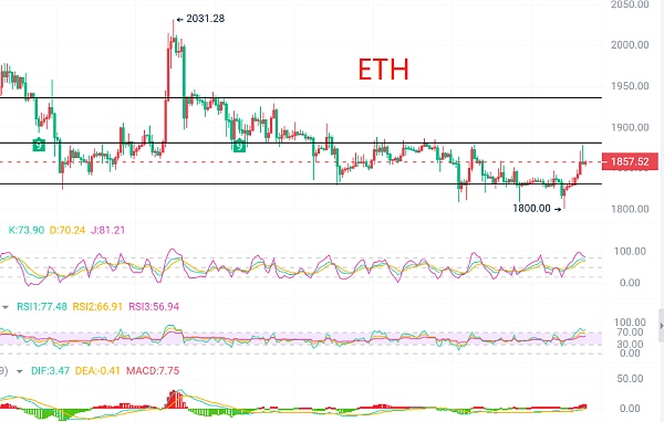 以太4小时图来看,行情下探1800一线启稳快速收复。守住第三浪上涨低点,尾盘收复上升,随着空间回踩的低点上移,蓄势后短线看进一步冲高,局部回踩也是多头趋势的蓄势走法,而快速收复了失地,表明短线多头强势。今日操作上后续积极看多,强势一点或许会直接冲高。