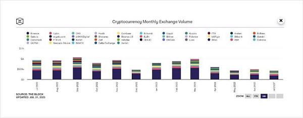 自 2022 年 7 月以来,加密货币交易所的月交易量有所下降。报告指出,这种现状反映出投资者对加密货币缺乏兴趣,BTC 的日内价格波动约为 0.1%,这对于加密货币来说是首次一段较长的时间。