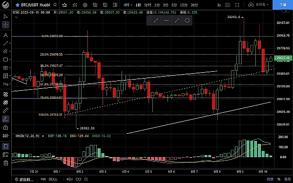 大饼昨日向下插针至29500支撑后迅速反弹,高位触及30137一线受阻回落,恭喜跟上昨日思路的朋友多单获利500点,目前币价在29630附近运行,四小时级别行情二次上行未破前高再次回落,macd多头逐步缩量双线聚拢有高位死叉迹象,短期行情有所反弹需要关注斐波那契23.6位置同样也是ma7均线压制,不破有继续下行的可能,日线级别macd呈多头运行双线金叉状态,但整体受ma30均线压制没有突破,日内走势偏向回落,激进现价可空,短线可以来回操作高空低多对待,上方压制29700-30000,下方支撑29300-29000