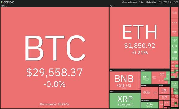 比特币从 28701 美元反弹,表明较低价格可以继续吸引买家。由于交易者等待新趋势走势的开始,复苏使价格保持在区间内。ARK Invest 最近的一份报告称,“7 月份比特币的波动性降至 6 年来的最低点。” 原本预期会出现强劲走势的交易者对 8 月份持续的区间波动感到失望。如果历史重演,那么8月和9月可能会成为下跌月份,因为它们的平均涨幅分别为0.73%和-5.01%。