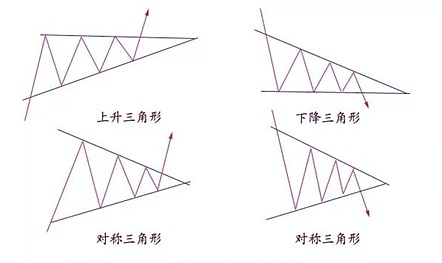 所谓三角形整理,是指币价经过一段时间的快速变动后,即不再前进而在一定区域内上下窄幅变动,等时机成熟后再继续以往的走势,其又分为三种,即:对称三角形、上升三角形和下降三角形三种。