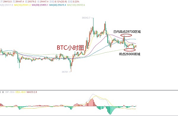 8月11日比特币(BTC)合约技术面分析:今日方面,大周期日线级别昨日报收小阴线,K线形态上连阴下跌,但价格还是均线下方,附图指标金叉运行,且当前回撤的力度很小,还没有抹平前面中阳上涨的涨幅,所以整体走势既不是弱势,也不是强势,依旧在区间之内;短周期小时图前一日白盘价格震荡,晚间美盘冲高高点29730区域附近承压回撤,凌晨低点位置在29300区域附近,整体波动不大,当前在早间下跌触及凌晨低点后再次反弹,但四小时图和日线图目前都是连阴形态,所以多单还是不能做,这样的走势容易妖,因此今日BTC短线合约交易策略:日内观望为主,欧盘强弱走势再择机进场;