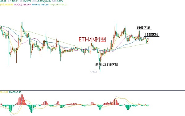 8月11日以太坊(ETH)合约技术面分析:今日方面,大周期日线级别昨日报收小阴线,K线形态上连阴,但整体力度很小,附图指标金叉运行,而反抽也没有向上破高延续,四小时图又是连阴死叉向下,所以整体走势还是震荡为主,涨跌都难延续,只能继续短线抓利润了。短周期小时图昨日美盘价格冲高回落,今日早间向下触及低点后反弹,这样来看就很明显的涨跌都没有力度;所以今日需要关注的就是早间高点1855区域以及昨日高点1865区域的阻力情况,下方低点支撑关注1840昨日低点和前期起涨点1815区域;因此今日ETH短线合约交易策略:日内观望为主,昨日空单持有的继续持有,止损1870区域,目标还是1830-1815区域;今日交易盘中实时给出;