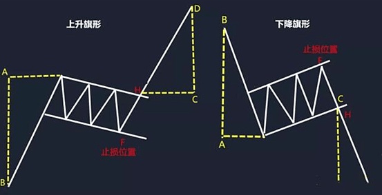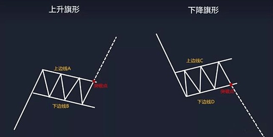 旗形,就是市场走势像一面挂在旗杆顶上的旗帜。这类形态通常在市场急速剧烈波动的时候出现。旗形可分为上升旗形、下降旗形,有时候还会出现尖旗形。上升旗形发生在急速、近乎垂直的价格上涨之后,它由上下两条平行的趋势线组成,形成平行四边形的旗形;而下降旗形则出现在急速、近乎垂直的价格下跌之后,其余同上。