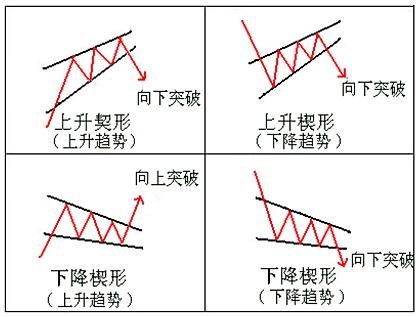 楔形形态多出现在上涨途中或下跌途中,因为不论强势上涨行情还是大幅下跌行情,价格不可能不停地上涨或下跌,都会有休整的时候。在行情休整的时候,K线走势往往会出现楔形形态。楔形形态也可以说是多方或空方的加油站,一般停留时间不长,一旦加满油,价格将再次启动。楔形走势一般可以分为上升楔形和下降楔形。