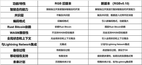 RGB v 0.10 的发布,其中包括共识层、标准库(用于钱包/交易所集成等)和命令行工具。下面的表格是我们根据 RGB 官方材料整理总结的新旧版本之间的主要区别,想要了解更详尽内容的读者可查看 RGB 官方文档和视频介绍: