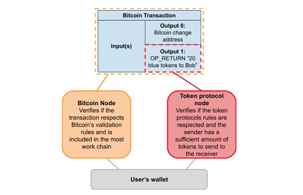 这样的信号机制通常是用 OP_RETURN 操作码来实现的,带有该操作码的输出会被普通的比特币节点无视,但可以被能够感知这些代币协议的节点解释,这些节点会实施代币协议的验证规则。
