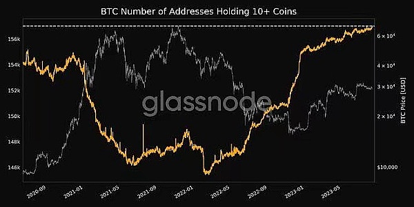与这些因素相反,鲸鱼的行为表明了比特币的积极未来。例如,Glassnode的数据显示,持有10个或更多BTC币的地址数量最近达到三年来的峰值,达到157,012个。