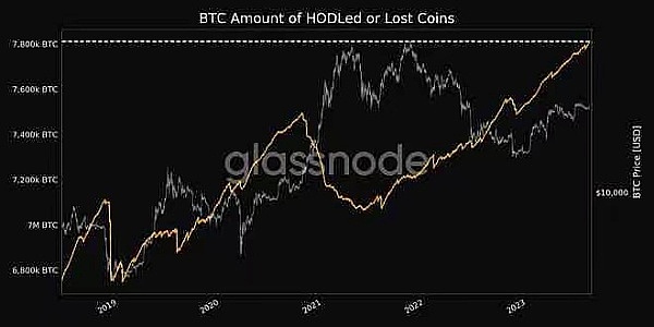 并行开发涉及从 BTC 地址观察到的 HODLing 行为。值得注意的是,截至发稿时,持有或丢失代币的数量达到了五年来的新高。