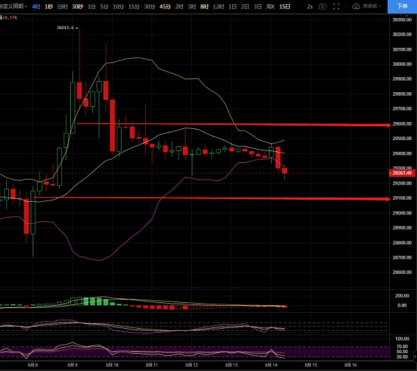 时间总是一晃而过,上周又已过去。可以看到上周的文章策略均有所斩获,另有两大消息面,一是CPI的力好 ,二是sec对etf的决议延迟 ,包括9月加息的概率降低 。都并未对行情造成较大的影响。上周行情基本一直处于震荡横盘状态,直到星期二凌晨开始才有点上行的状态,周三插针引来了拉伸最高抵达30250一线后未能站稳迅速回落,周末行情犹如一潭死水,持续的弱势震荡,走出的空间也及其有限,。毫无太多的操作空间可言,周末的横盘后早间走出了小幅的下探,目前币价徘徊于29200附近运行,咱们看看今日盘面走势情况。