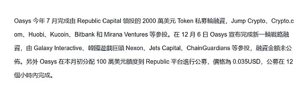 我选择大筹码的标的,基本是长期的,我相信这个行业的玩法能覆盖到传统游戏里让大家都来参与,那么Oasys相较于其他半路出家的竞品会有很好的优势,投资方游戏大厂居多的背景加上优秀的体验设计,目前的筹码是属于低价的了,翻倍是有机会的,我自己的Gamefi也有部署上去,反响体验不错。