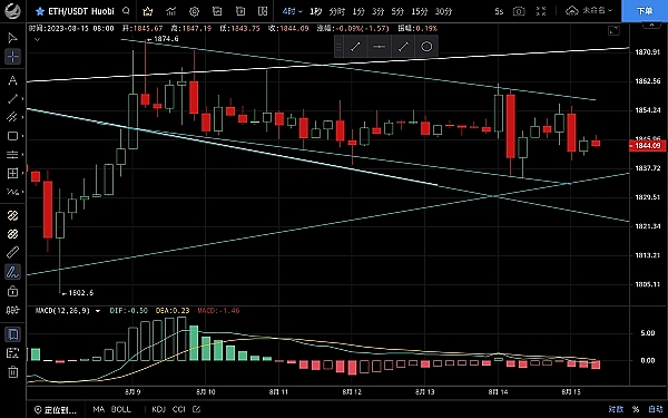 以太坊整体走势比大饼弱,昨日两次触及1835一线未破支撑反弹,高位触及1856一线受阻回落,恭喜跟上昨日思路的朋友空单获利20点,目前币价在1843附近运行,四小时级别k线阴阳交替多空反复,短期走势均不延续,macd空头逐步放量双线死叉向下运行,短期行情虽有反弹但力度较弱,目前关注ma60和90日均线支撑,日线级别两次跌至下方通道线支撑反弹,短期走势空间逐渐变窄,上方关注1855区域,下方1830,区间未破前高空低多对待,稳健者可以观望等待方向走出,上方压制1860-1880,下方支撑1830-1810