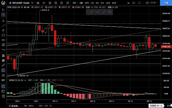 大饼昨日整成呈插针反弹走势,行情一路震荡上行,高位触及29694一线受阻回落,低位跌至29258一线,恭喜跟上昨日思路的朋友空单获利400点,目前币价在29380附近运行,四小时级别行情呈反包走势,虽有反弹但未能延续,一根阴k吞没前根涨幅,目前行情仍在窄幅震荡,上方斐波那契38.2有效压制,macd走粘合,ma多根均线走平,整体仍在三角区间震荡,且波动逐渐变窄,目前能做的只有高空低多,稳健等待方向走出再做右侧建仓,预计三天内出方向,上方压制29800-30100,下方支撑28500-28000