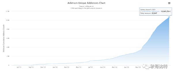 Arbiscan.io 数据显示,截至 8 月 7 日,Arbitrum 网络唯一地址数量已突破 1064 万个(469290 个),相比今年年初 1 月 1 日的 239 万个增长逾 400%。