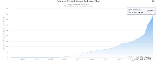 同时 Optimism 浏览器数据显示,截至 8 月 7 日,Optimism 网络唯一地址数量突破 762 万个,相比今年年初 1 月 1 日的 240 万个也是增长三倍有余。