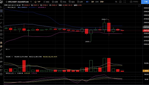 从四小时来看,布林带三线平行运行状态,早间收了一根长的下引线后缓慢反弹,下方KDJ三线持续上扬后受挫,上涨放缓,MACD多空能量柱未见明显变化,从盘面来看上方29700附近压力还是较为强力,同时下方29000支撑也是比较稳固,未能得到有效破位前,单边情绪都不大明显,从日线来看阶梯式下行趋势被打破,行情在经历过连阴下跌后目前也是出现十字星反转也是明显的受支撑压制,一小时可以看出多头能量柱呈逐渐放量状态,也是收了较长的下影线,晚间的向上差针遇阻迅速回落,也只是象征性的,日内短线来看,多空延续还会陷入拉锯!