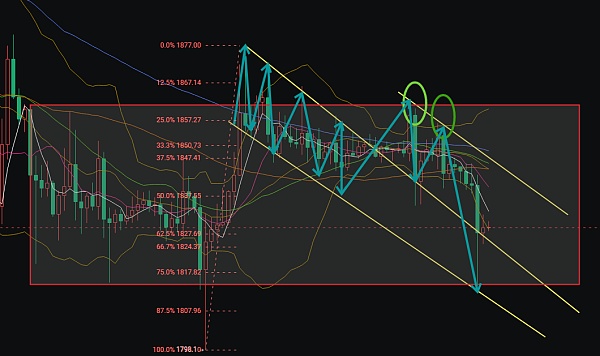 以太坊最近一直也是和大家说目前依旧是下行通道,新的下行通道高点也是逐步下移,凌晨的行情直接破位当前的通道,直插前期下行通道底部,下方重要支撑1835也是快速破位,最低来到了1813附近,毕竟这个位置也接近一个短期低点,反弹是毫无疑问的,经过修复目前处于1829运行