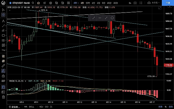 以太坊走势和大饼一致,经过多天横盘震荡凌晨终于向下破位,低位跌至1779一线支撑反弹,恭喜跟上思路的朋友,目前币价在1798附近运行,日线级别k线三连阴,跌破下降通道,短期跌至斐波那契61.8附近支撑反弹,若日线收在ma200下方则有延续下跌的可能,ma均线向下发散,空头逐步放量双线死叉向下运行,整体结构来看偏向空头,四小时级别若收长下影预计会走一波反弹,上方阻力在1810附近,关注反弹力度,大级别走势偏空,有机会再创低点,思路建议反弹高空为主低多为辅,上方压制1810-1830,下方支撑1780-1755