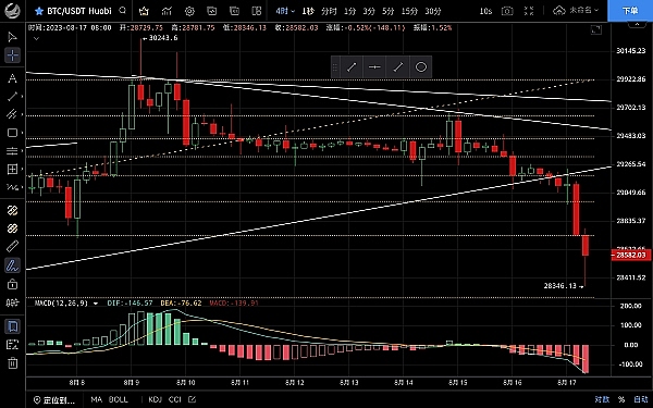 大饼昨日整体呈震荡下行但波动不大,直到凌晨空头发力加速下跌,低位至28346一线支撑反弹,目前币价在28585附近运行,四小时级别经过长时间震荡终于向下破位,macd空头逐步放量双线死叉向下运行,短期行情暂时止跌,有反弹迹象,预计力度不会太大,关注日线收线若有效破位低点则延续下行,大级别走势偏向空头,中线有机会去21000附近,思路建议反弹高空为主低多为辅,上方压制28800-29200,下方支撑28300-28000