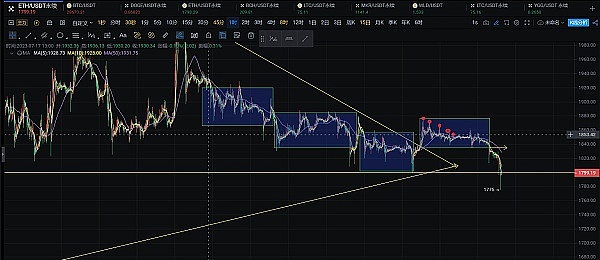 以太坊的跌势要比大饼快,ETH也一直在走新低,前面1800的支撑也是再次跌穿,1775这里也是最后一道防线了,再次跌穿的话多头就基本瓦解了,开始空头的新篇章了,所以今日也是重点关注1775一线的支撑。
