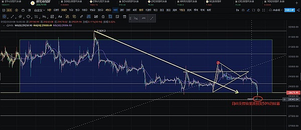 目前大饼小时级别来看这波回踩刚好打在了斐波那契50%的这个数值上,也表明这波回踩来到了一个比较深的位置,跌破50%也就意味着多头的趋势即将完结,要反转为空的一个信号